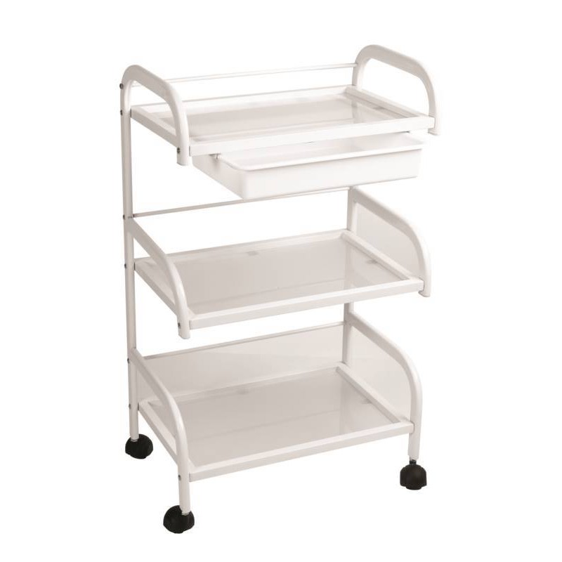 La table de travail Viola avec trois plateaux ouverts est idéale pour le rangement du matériel de beauté. Le petit tiroir situé en haut permet de ranger, entre autres, des accessoires. Cette table de travail est composée de verre dépoli et d’un cadre métallique blanc, équipé de roulettes. Dimensions: 50 x 32 x 85 cm